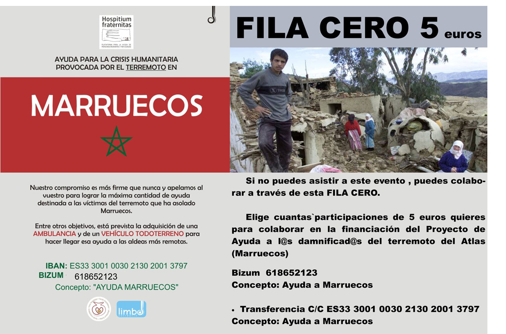 Por su parte, Alfonso Tabasco ha recordado que además del donativo de 5 euros de la entrada, habrá una fila cero para aquellas personas que quieran contribuir con la causa. De esta manera, se puede enviar el donativo a través de bizum, en el número 618 652 123, o a través de transferencia bancaria, en el número de cuenta ES33 3001 0030 2130 2001 3797. En ambos casos, hay que indicar el concepto «Ayuda a Marruecos».