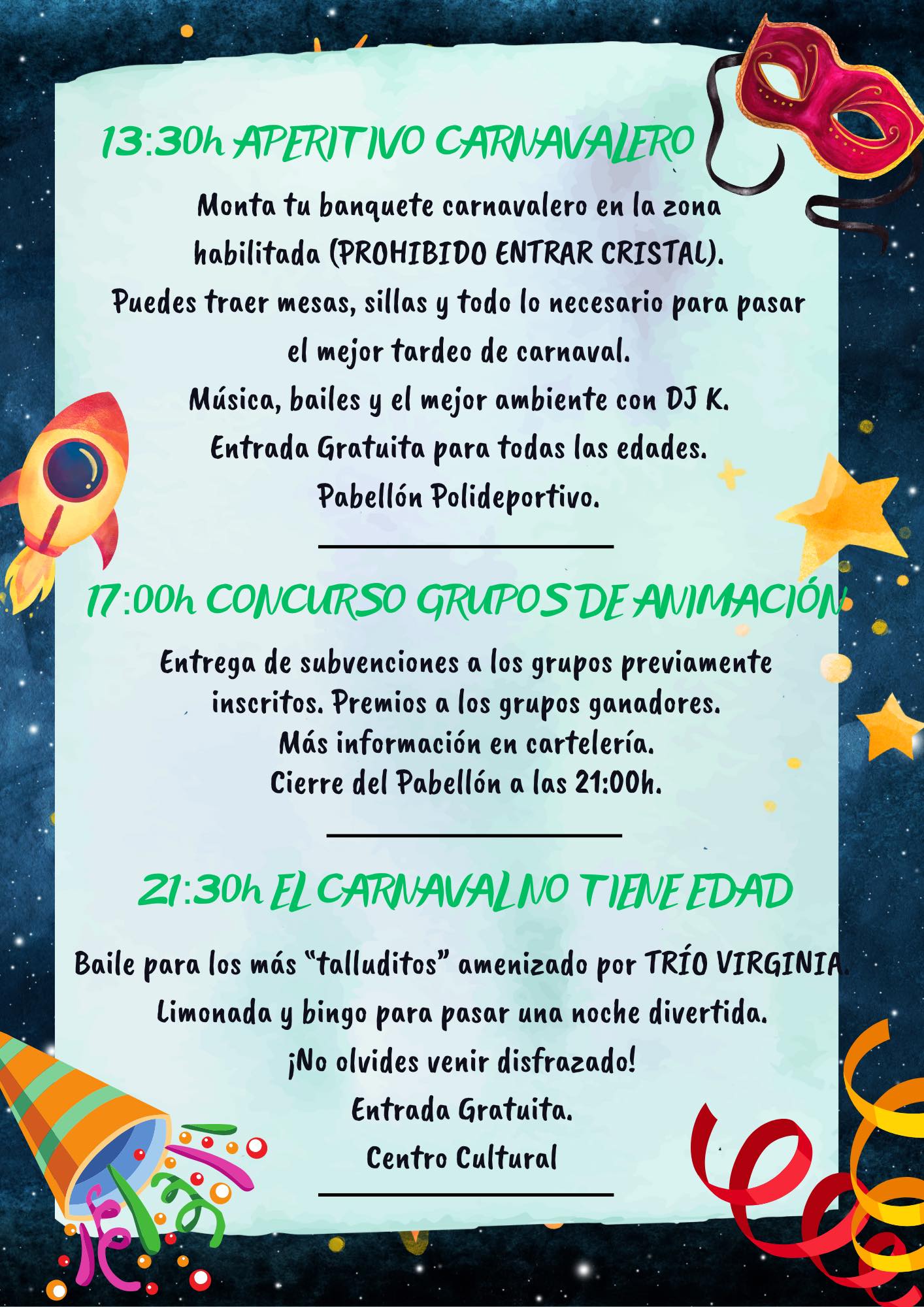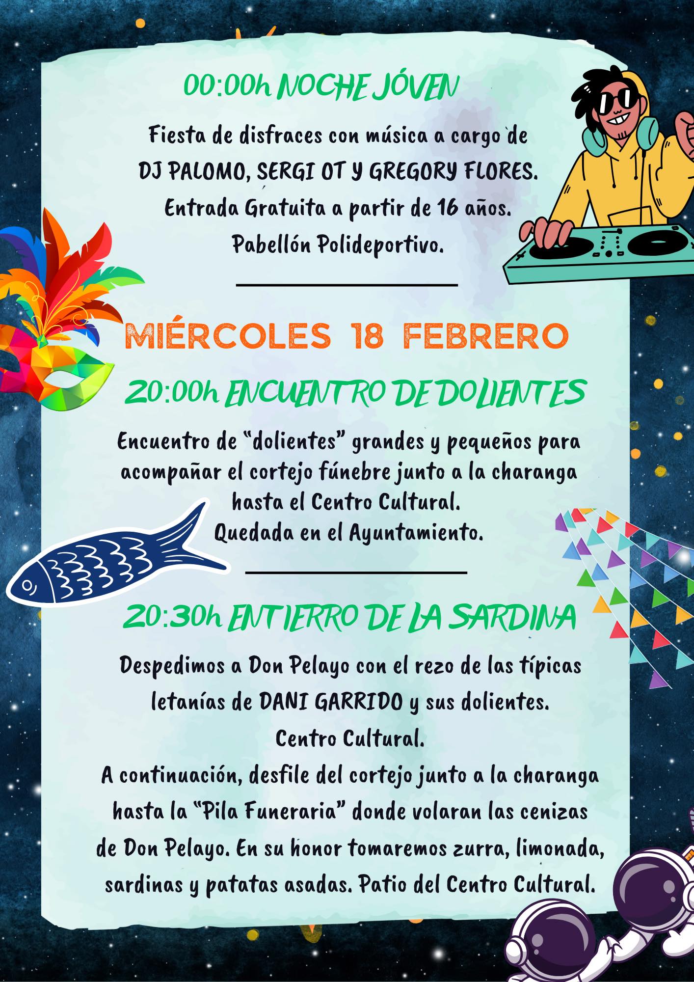 Los actos comenzarán el viernes 13 con la inauguración del carnaval infantil junto a los niños y niñas del colegio, acompañados por el grupo Gominolas, dando paso por la noche a una Noche Joven de temática espacial, con sesiones musicales a cargo de DJ Traxpala, DJ Esteban Pardo y Jhonatan Espinosa, que convertirán la localidad en una auténtica galaxia festiva.