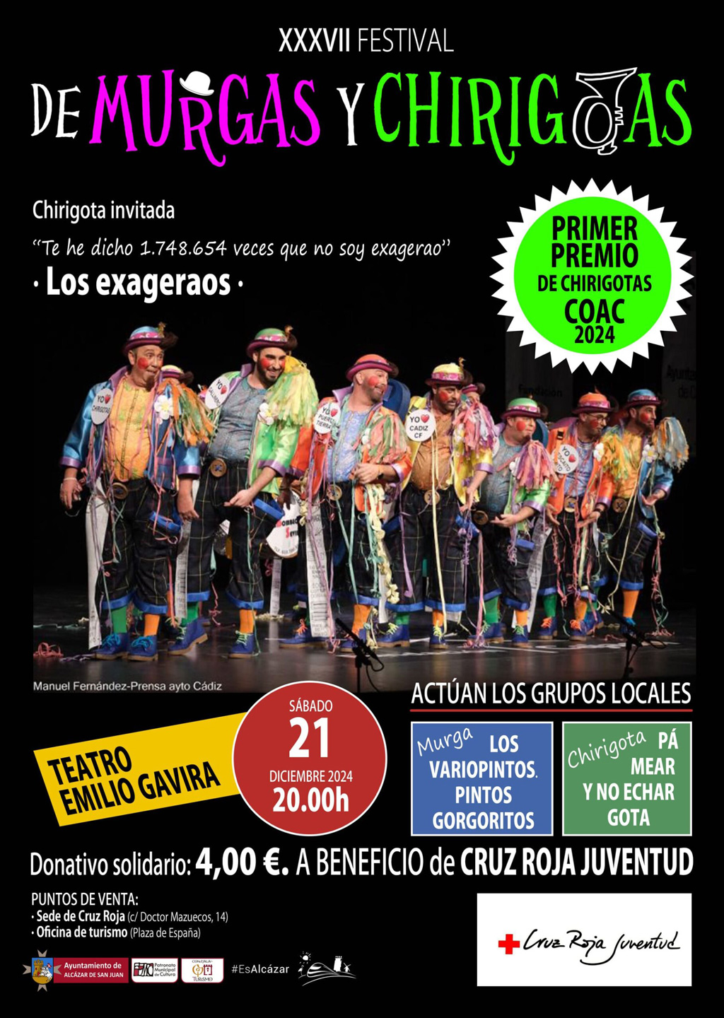 El próximo 21 de diciembre el Teatro Emilio Gavira de Alcázar de San Juan volverá a llenarse de risas y de las mejoras coplas y cuplés de las voces de las chirigotas y murgas locales, ‘Pa mear y no echar gota’ y ‘Los variopintos’, y de la chirigota de Cádiz ‘Te he dicho 1.748.654 veces que no soy exagerao’, más conocidos como Los exageraos, en el XXXVII Festival de Murgas y Chirigotas de Alcázar.